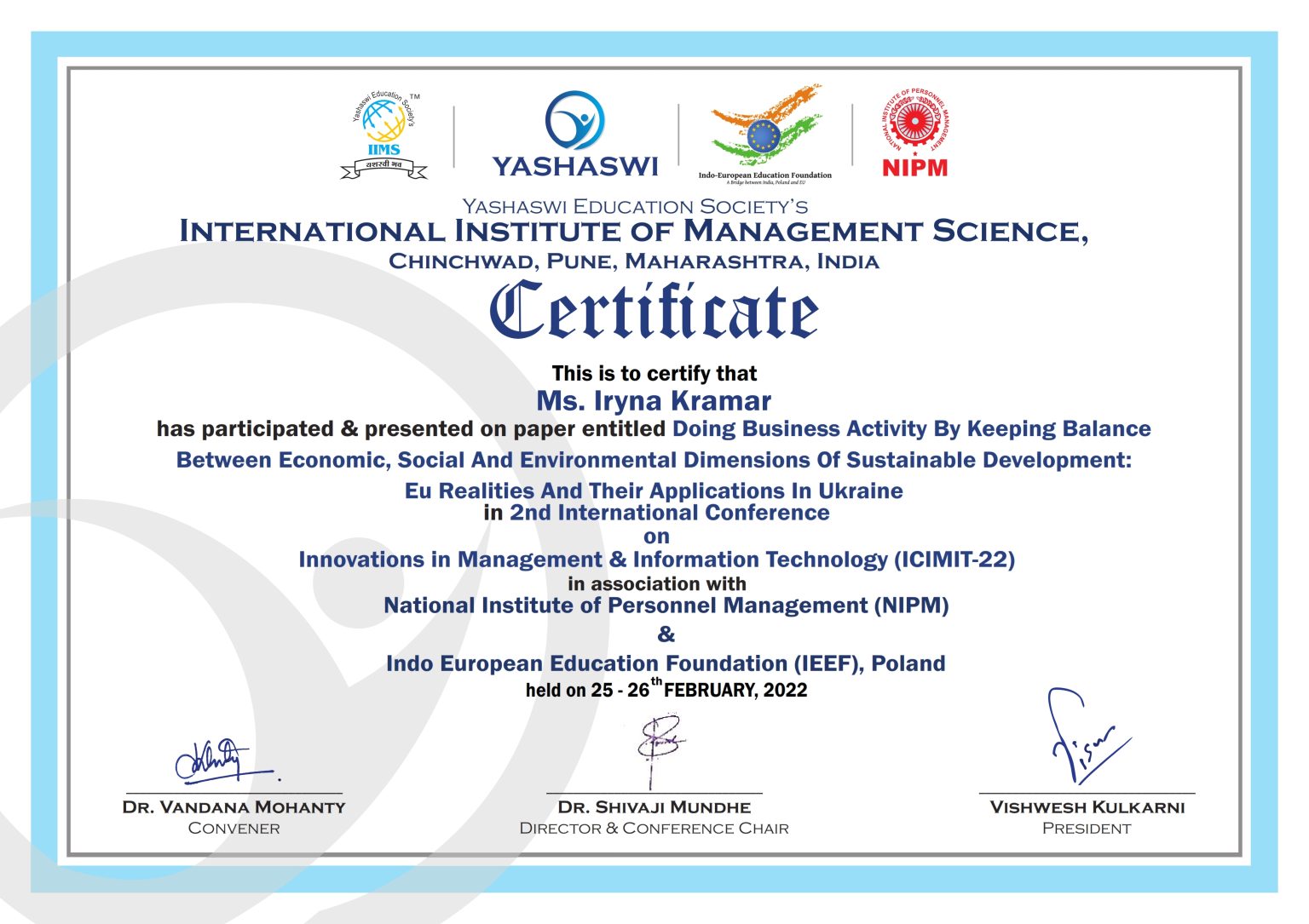 While implementing the EU Erasmus+ Project (Jean Monnet Module) “An interdisciplinary approach to waste management study: implementing the EU practices” (621029-EPP-1-2020-1-UA-EPPJMO-MODULE) Prof. Iryna Kramar, Prof Nataliia Marynenko and Prof. Tetiana Vitenko participated in the 2nd International Virtual Conference On “Innovations in Management & Information Technology” (ICIMIT – 22), held in Pune, INDIA on February, 25th-26th, 2022. The conference … Continue reading Participation in the 2nd International Virtual Conference On “Innovations in Management & Information Technology”